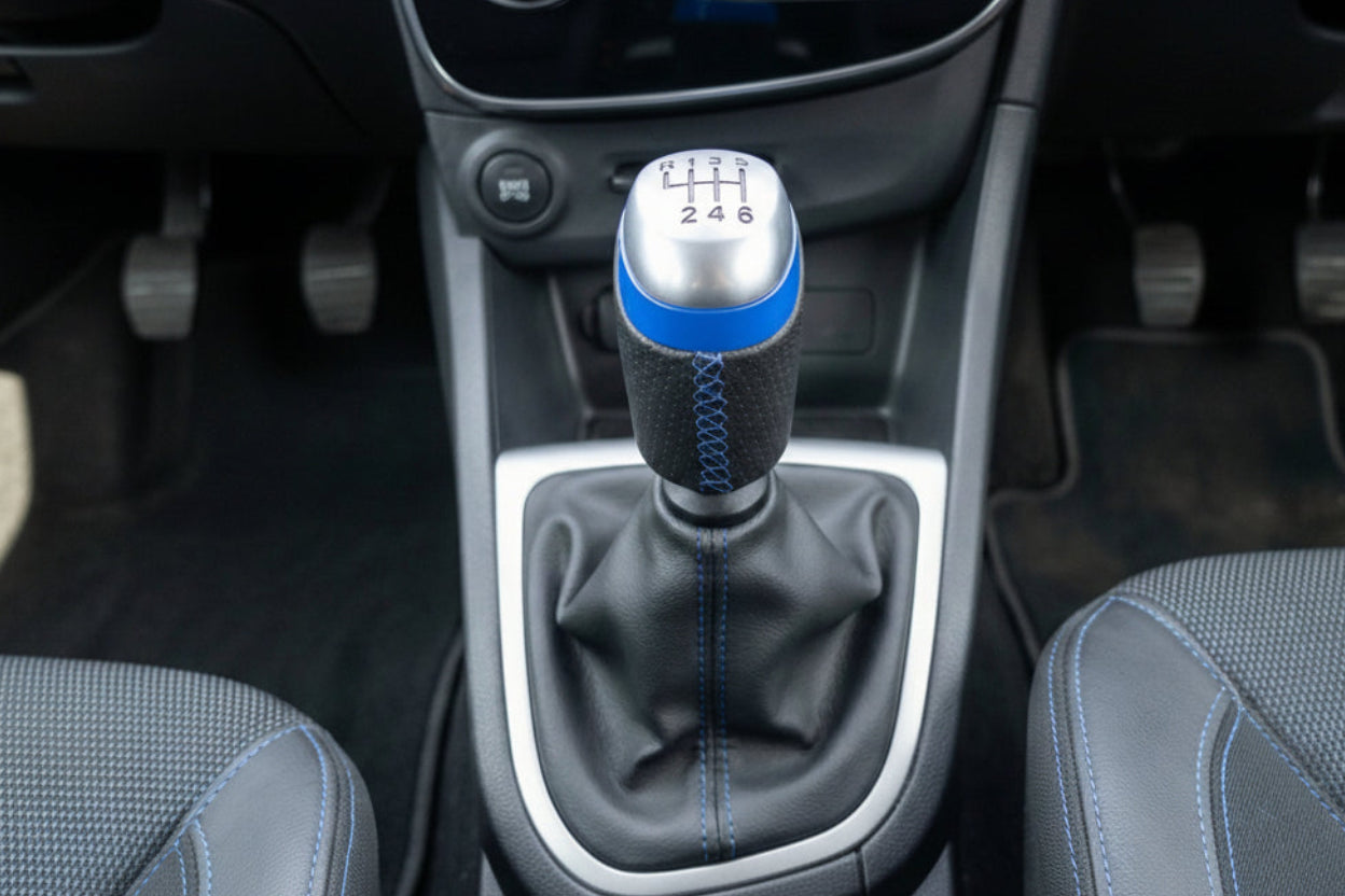La couture rouge contrastante apporte un aspect dynamique et élégant à la console centrale. La structure interne en plastique ABS offre une robustesse thermique et mécanique idéale pour supporter les passages de rapports fréquents. La grille des 5 vitesses est gravée avec une netteté parfaite pour faciliter la lecture des rapports. Le poids de 141,5 g permet une inertie équilibrée qui améliore la sensation de guidage lors du mouvement du bras. La qualité supérieure des matériaux sélectionnés limite les traces d'usure liées aux frottements répétés de la paume.
